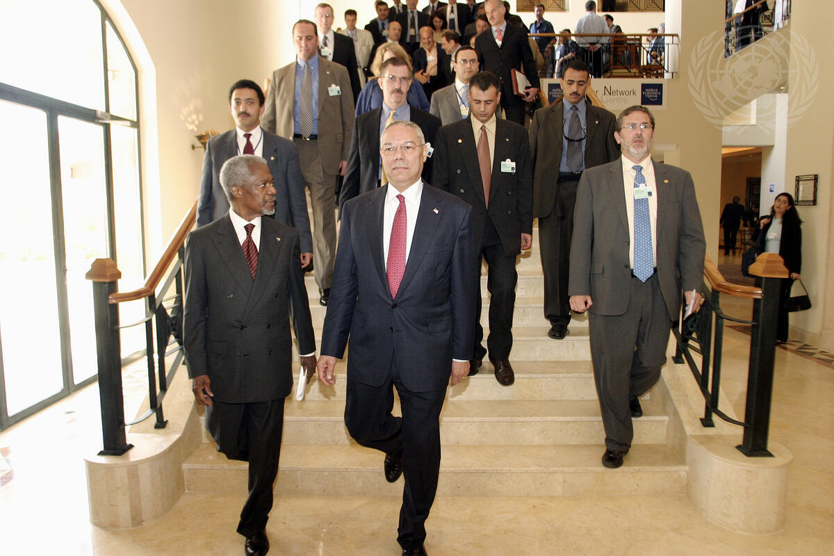 Secretary-General Kofi Annan (left), speaks with Colin Powell, Secretary of State of the United States, on their way to the Quartet meeting.