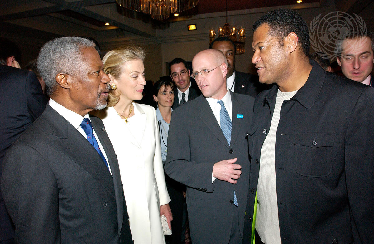 Secretary-General Kofi Annan (left) and Nane Annan (second from left) speaks with Laurence Fishburne (right) at the United States Fund for UNICEF Gala at the Beverly Hilton Hotel.