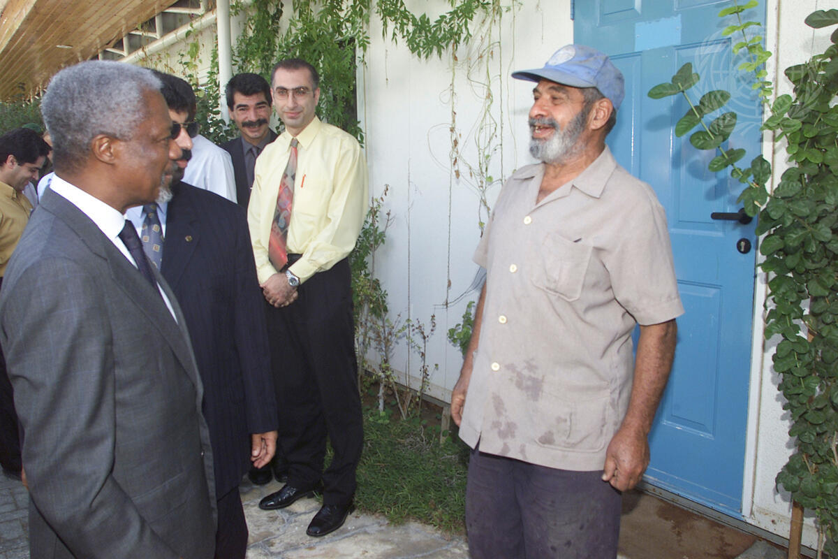 The Secretary-General travelled to the Middle East on an urgent mission to help defuse the crisis in that region. Secretary-General Kofi Annan (left) speaking with some of the staff of United Nations Special Commission (UNSCOM).