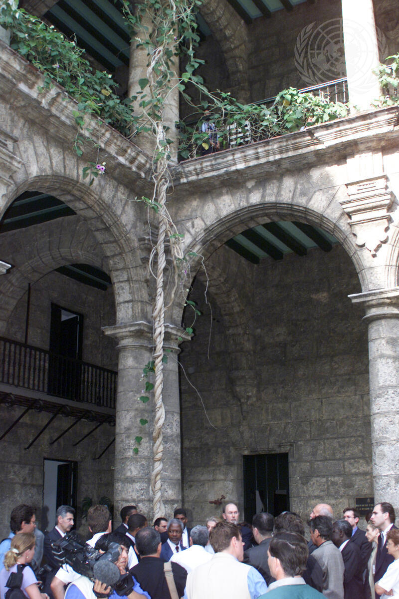 Secretary-General Kofi Annan travelled to Cuba for an official visit, 10-14 April 2000. Mr. Annan and Nane Annan (centre) visiting Havana Vieja (Old Havana), which is being restored.