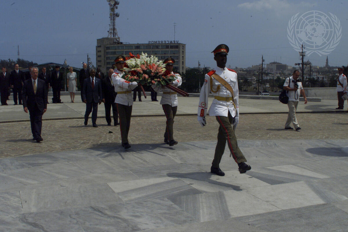 Secretary-General Kofi Annan travelled to Cuba for an official visit, 10-14 April 2000. Mr. Annan attending a wreath-laying ceremony at Jose Marti Monument in Revolution Square.