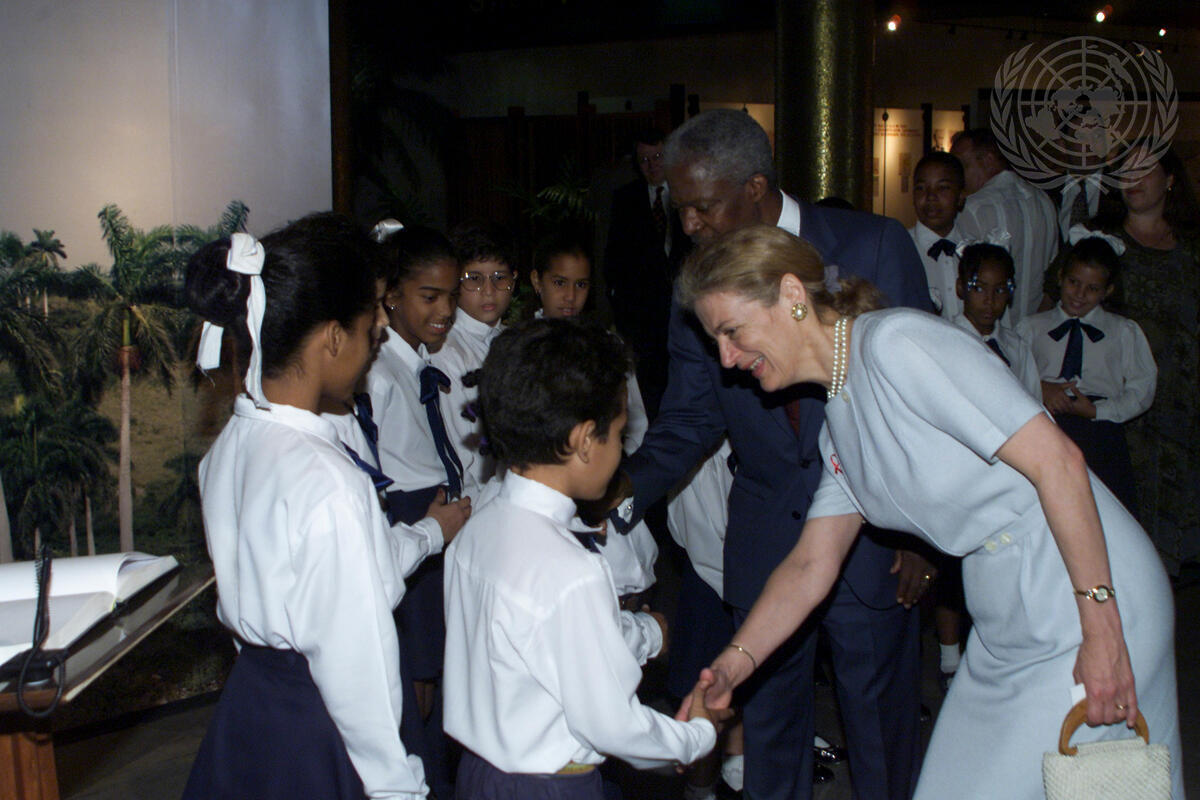 Secretary-General Kofi Annan travelled to Cuba for an official visit, 10-14 April 2000. Mr. Annan and Nane Annan (right) thanking children who sang for them on a visit to Jose Marti Memorial.