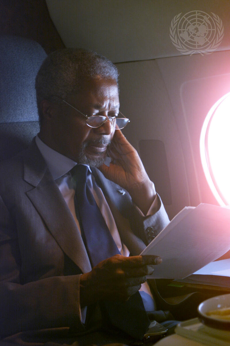Secretary-General Kofi Annan reading on the plane before arriving in Sarajevo.