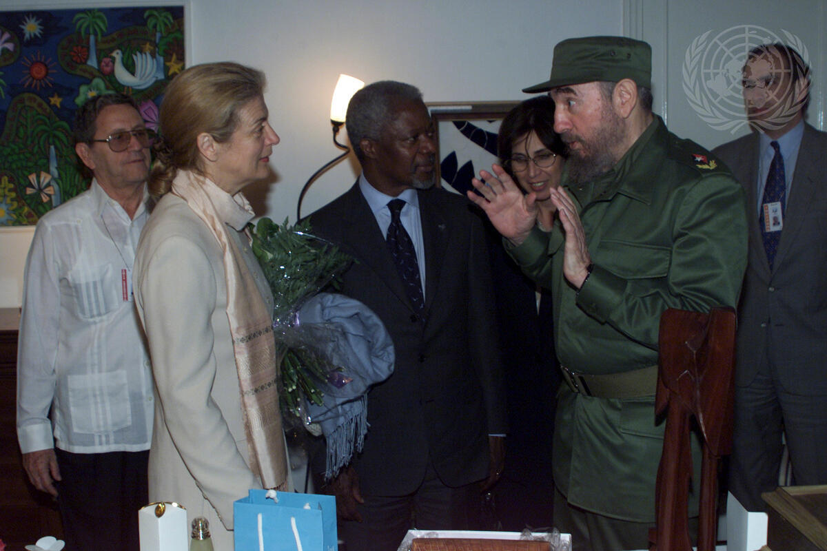 Secretary-General Kofi Annan travelled to Cuba for an official visit, 10-14 April 2000. President Fidel Castro (right) welcoming Secretary-General Kofi Annan and Nane Annan at the Guest House in Havana.