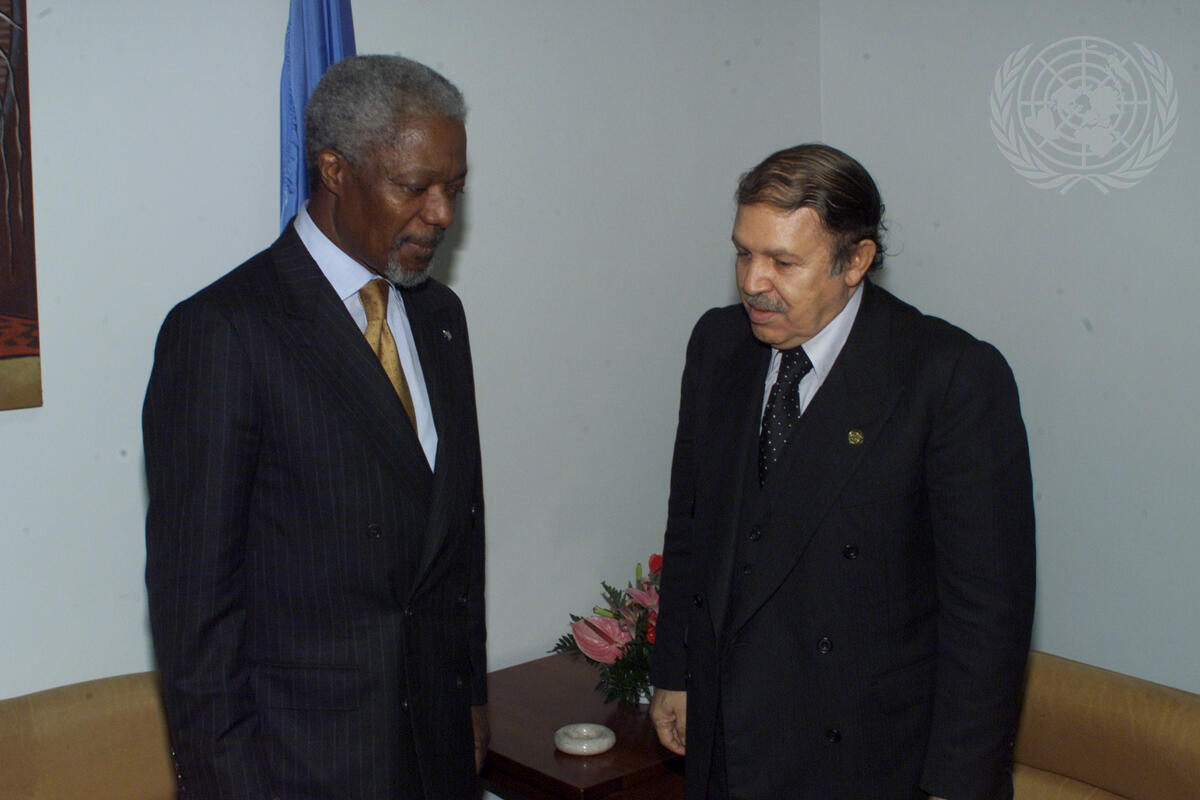 Secretary-General Kofi Annan travelled to Cuba for an official visit, 10-14 April 2000. Mr. Annan (left) meeting with Abdelaziz Bouteflika, President of Algeria, at the Group of 77 Summit meeting in Havana.