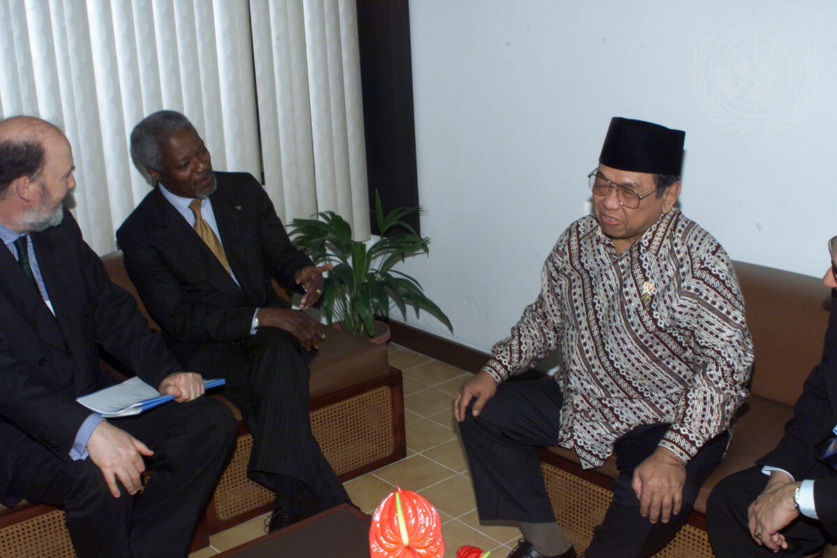 Secretary-General Kofi Annan travelled to Cuba for an official visit, 10-14 April 2000. Mr. Annan (left) meeting with Abdurrahman Wahid, President of Indonesia, at the Group of 77 Summit meeting in Havana. Kieran Prendergast, United Nations Under-Secretary-General for Political Affairs, is seated far left.
