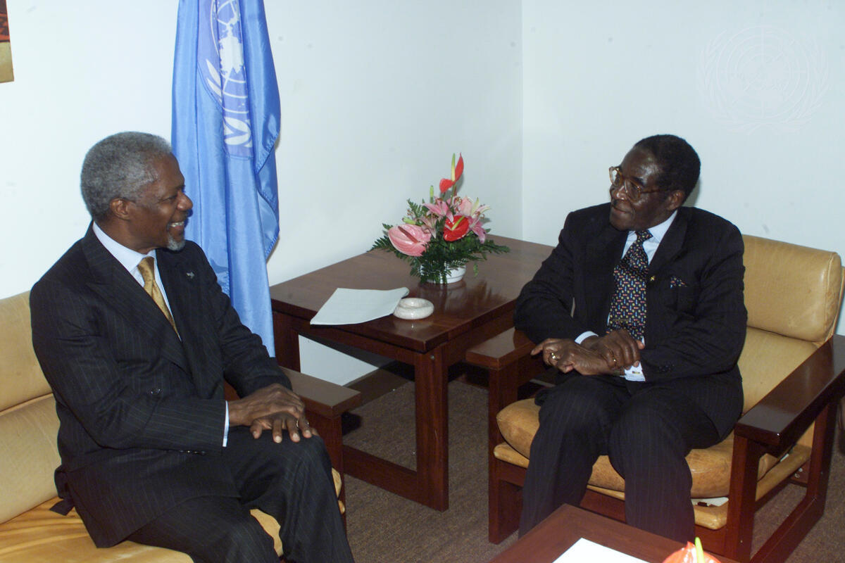 Secretary-General Kofi Annan travelled to Cuba for an official visit, 10-14 April 2000. Mr. Annan (left) meeting with President Robert Mugabe of Zimbabwe, at the Group of 77 Summit meeting in Havana.