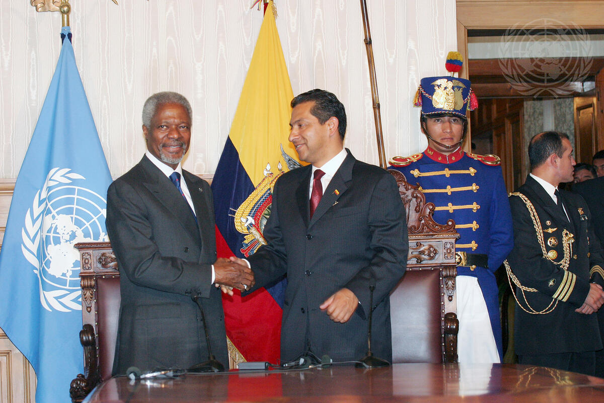 Secretary-General Kofi Annan (left) shakes hands with Lucio Gutiérrez Borbúa, President of Ecuador, at a press conference.