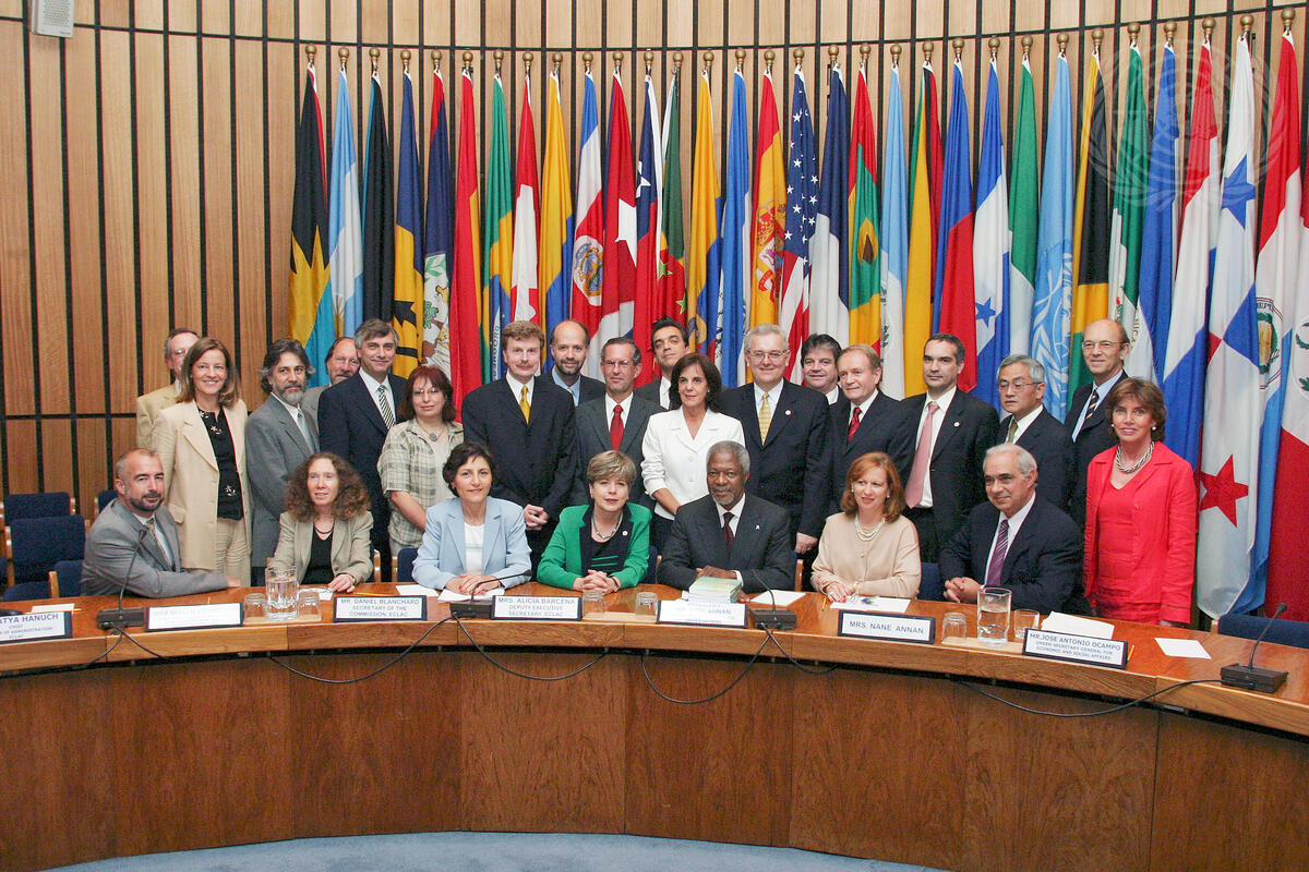 Secretary-General Kofi Annan (seated, third from right) attends a briefing by the ECLAC Directors in the Sala Celso Furtado.