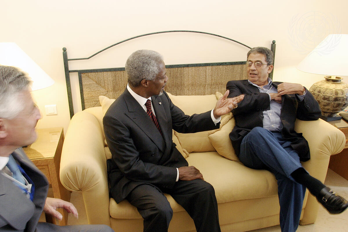 Secretary-General Kofi Annan (centre) meets with Amr Moussa, Secretary-General of the League of Arab States, to discuss the implementation of the Quartet's peace ""roadmap"" for the Middle East.