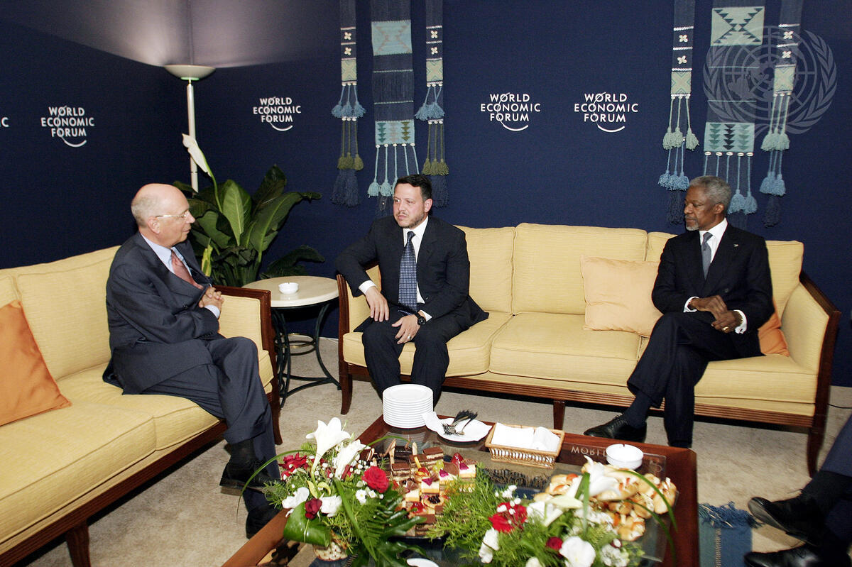 Secretary-General Kofi Annan (right) and His Majesty King Abdullah II ibn Al Hussein (centre), speaks with Klaus Schwab, Executive Chairman of the World Economic Forum, before the Secretary-General addresses the closing meeting of the conference.