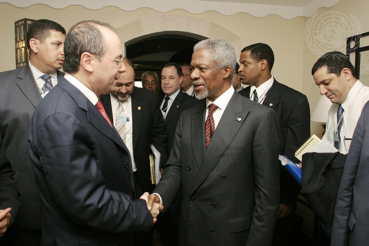 Secretary-General Kofi Annan (right) meets with Silvan Shalom, Foreign Minister of Israel, to discuss the implementation of the Quartet's peace ""roadmap"" for the Middle East.