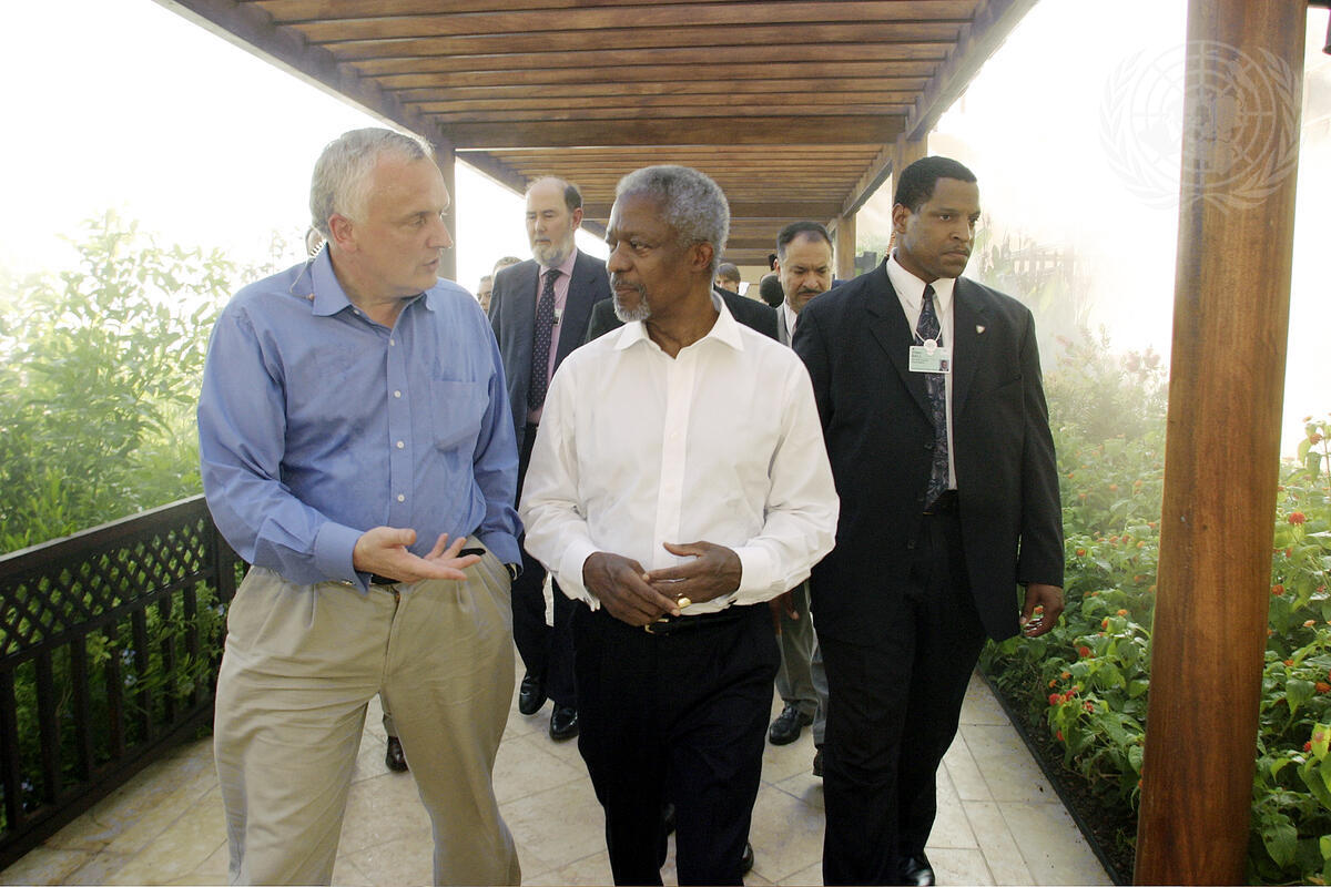 Prior to the live interview with BBC correspondent Nick Gowing, United Nations Secretary-General Kofi Annan has just completed a speech at the concluding Plenary Session of the World Economic Forum, in the Royal Tent on the grounds of the Marriott Hotel, at the Dead Sea in Jordan.