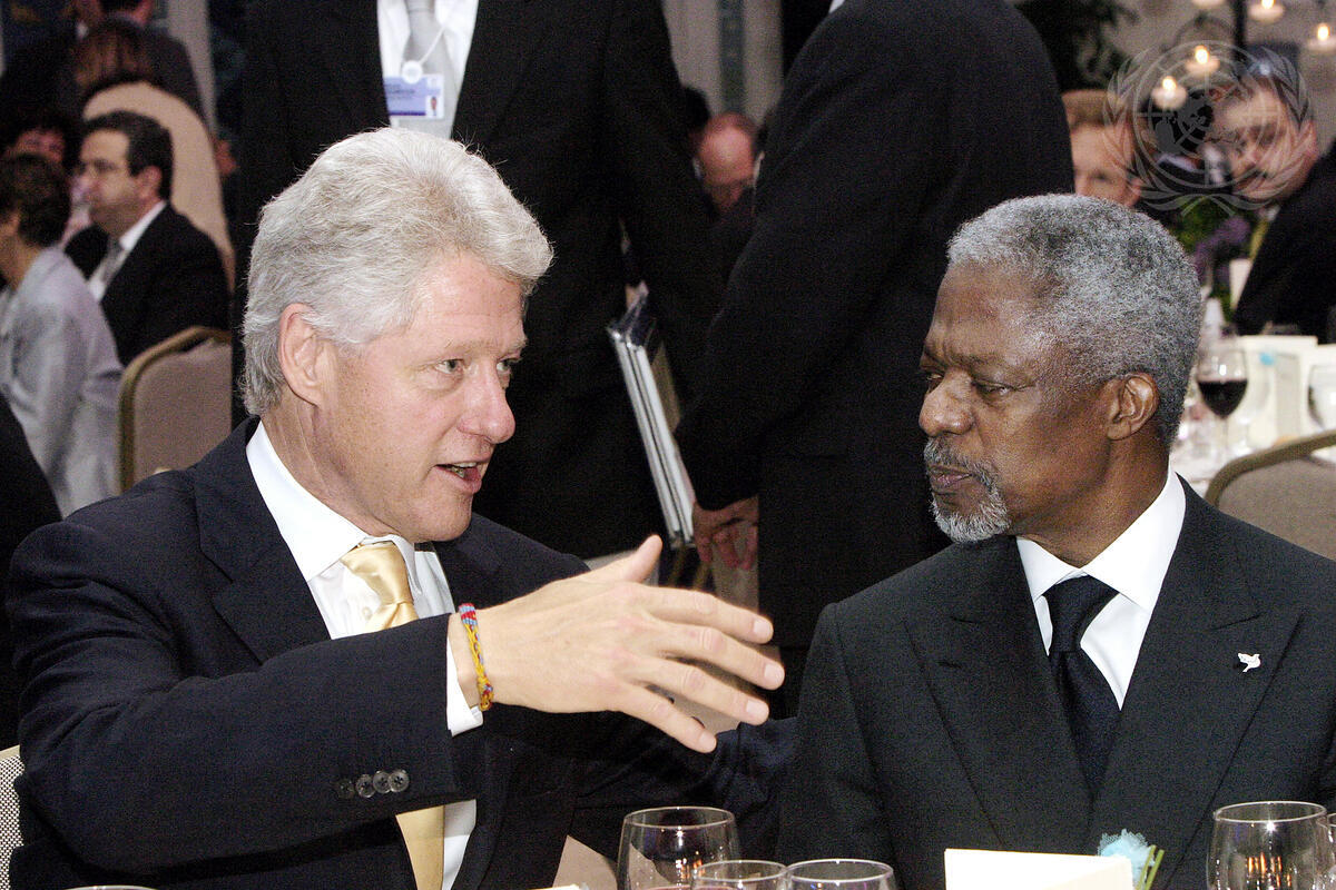 United Nations Secretary-General Kofi Annan (right) with Former President of the United States William Clinton at a state dinner in the Royal Tent at Jordan's Dead Sea.