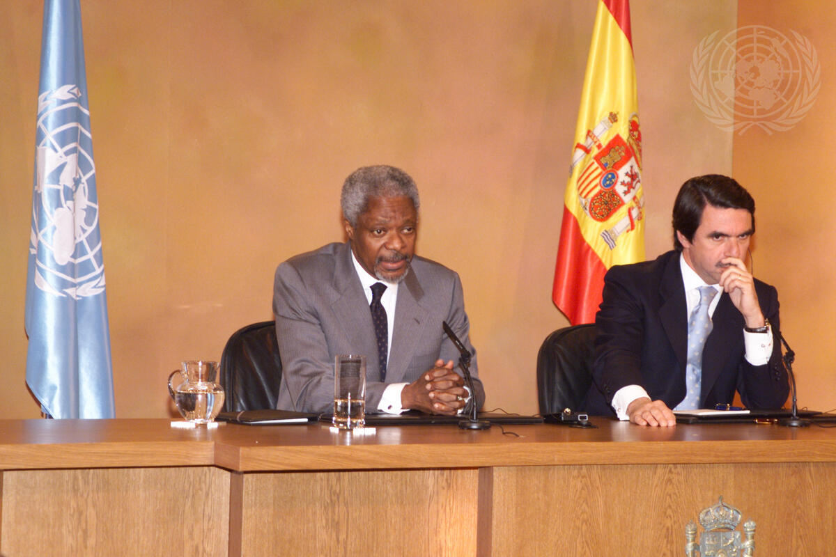 Secretary-General Kofi Annan (left) attends a meeting with José María Aznar, President of the Government of Spain.