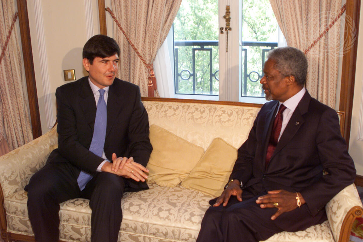 Secretary-General Kofi Annan with Manuel Pimentel Sile (left), Minister of Labour and Social Affairs of Spain.