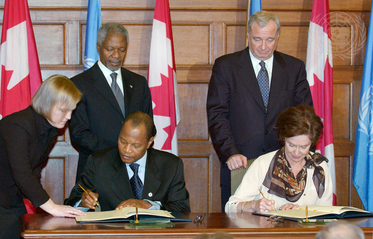Secretary-General Kofi Annan (left, standing) and Paul Edgar Philippe Martin (right, standing), Prime Minister of Canada, witness the signing of Canada and Economic Community of West African States (ECOWAS) Peacekeeping Cooperation Agreement. Left to right, seated: Mohamed Ibn Chambas, Executive Secretary of ECOWAS, and Aileen Carroll, Minister for International Cooperation, signing the Agreement.