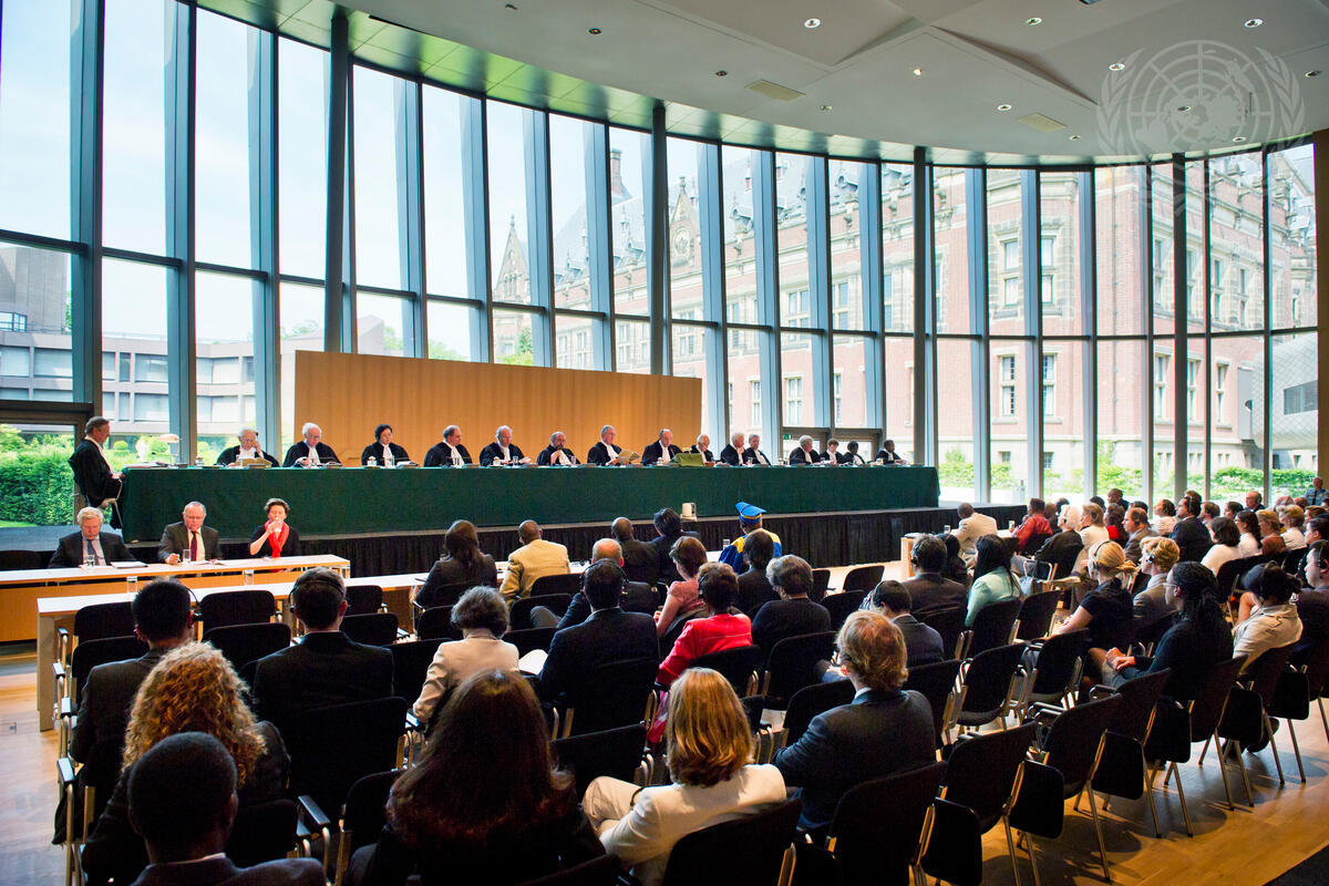 Vue de la Cour internationale de Justice (CIJ) alors que son président, M. Peter Tomka, donne lecture de l'arrêt de la Cour sur la question de l'indemnisation en l'affaire relative à Ahmadou Sadio Diallo (République de Guinée c. République démocratique du Congo). Cette séance a, exceptionnellement, eu lieu dans l'auditorium de l'Académie de droit international de La Haye.
