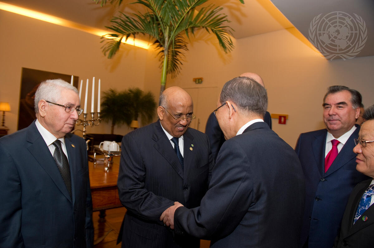 Secretary-General Ban Ki-moon (centre, back to camera) greets Dileïta Mohamed Dileïta, Prime Minister of the Republic of Djibouti. Abdelkader Bensalah (far left), President of the Council of the Nation of Algeria, and Emomali Rahmon (right), President of Tajikistan, look on.