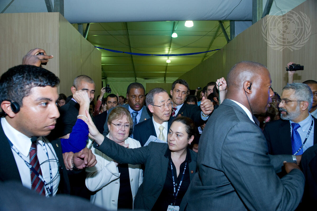 Secretary-General Ban Ki-moon (centre) arrives at an event on oceans, held on the margins of the Rio+20 Conference on Sustainable Development and organized by the World Bank with the Governments of Kiribati and Monaco.
