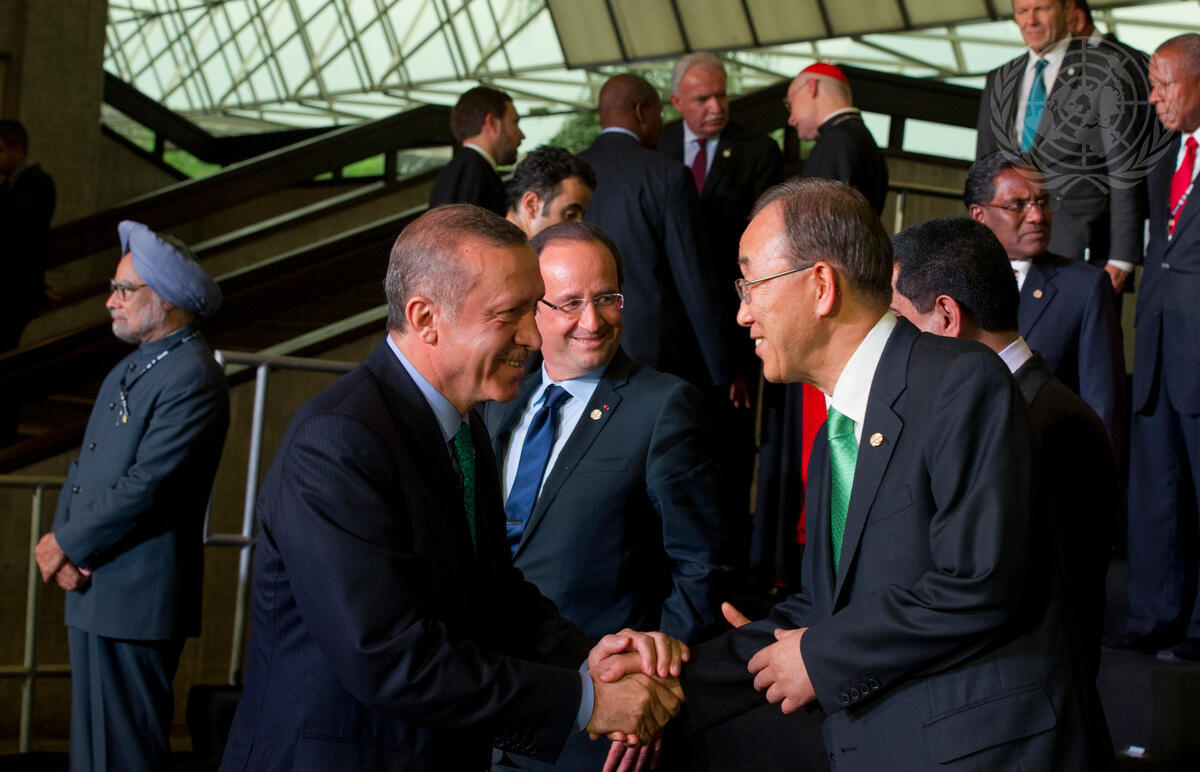 Secretary-General Ban Ki-moon (front, right) greets head of state and government, including Recep Tayyip Erdogan, Prime Minister of Turkey, as they pose for a group photo at the UN Rio+20 Conference on Sustainable Development in Rio de Janeiro, Brazil.