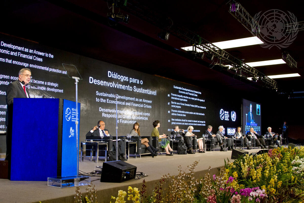 Luis Nassif (left, at podium) of TV Brasil moderates the dialogue, “Sustainable Development as an Answer to the Economic and Financial Crises”, held ahead of the 20 June high-level segment of the UN Rio+20 Conference on Sustainable Development, in Rio de Janeiro, Brazil.