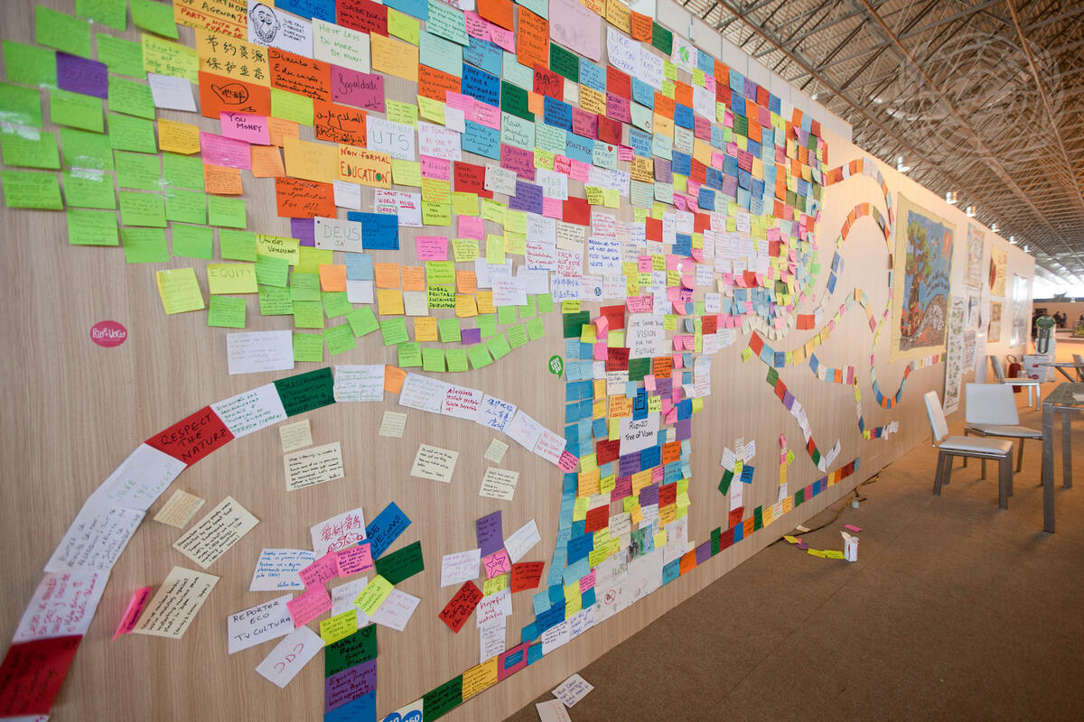 A scene from the Rio Centro Convention Centre, site of Rio+20, the UN Conference on Sustainable Development, taking place in Rio de Janeiro on 20-22 June. Messages of hope on a wall of the entrance hall.