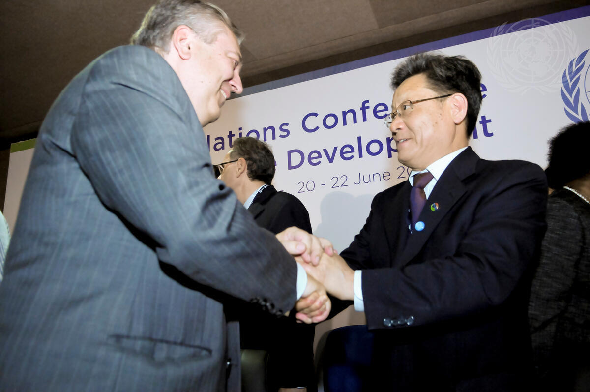 Sha Zukang (right), Secretary-General of the Rio+20 UN Conference on Sustainable Development, shakes hands with Luiz Alberto Figueiredo Machado, Executive Secretary of the Brazilian National Commission for Rio+20, after reaching consensus on a final outcome document for the Conference ahead of its high-level opening tomorrow.