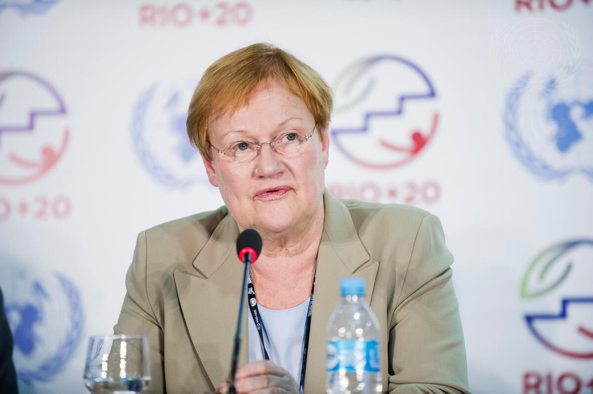 Tarja Halonen, former President of Finland and Co-Chair of the Secretary-General’s High-Level Panel on Global Sustainability, speaks at a press conference on the Panel’s report, titled “Resilient People, Resilient Planet: A Future Worth Choosing”.