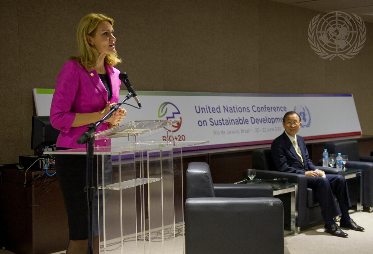 Helle Thorning-Schmidt (at podium), Prime Minister of Denmark, introduces Secretary-General Ban Ki-moon at a side event on “Green Growth for All”.