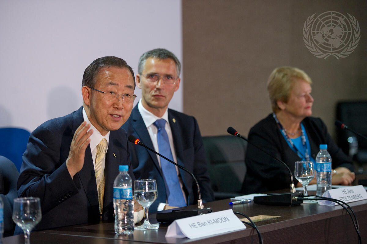 Secretary-General Ban Ki-moon (left), alongside Norwegian Prime Minister Jens Stoltenberg (next to Mr. Ban), during a side event on ""Energy, Gender and Economic Growth"".