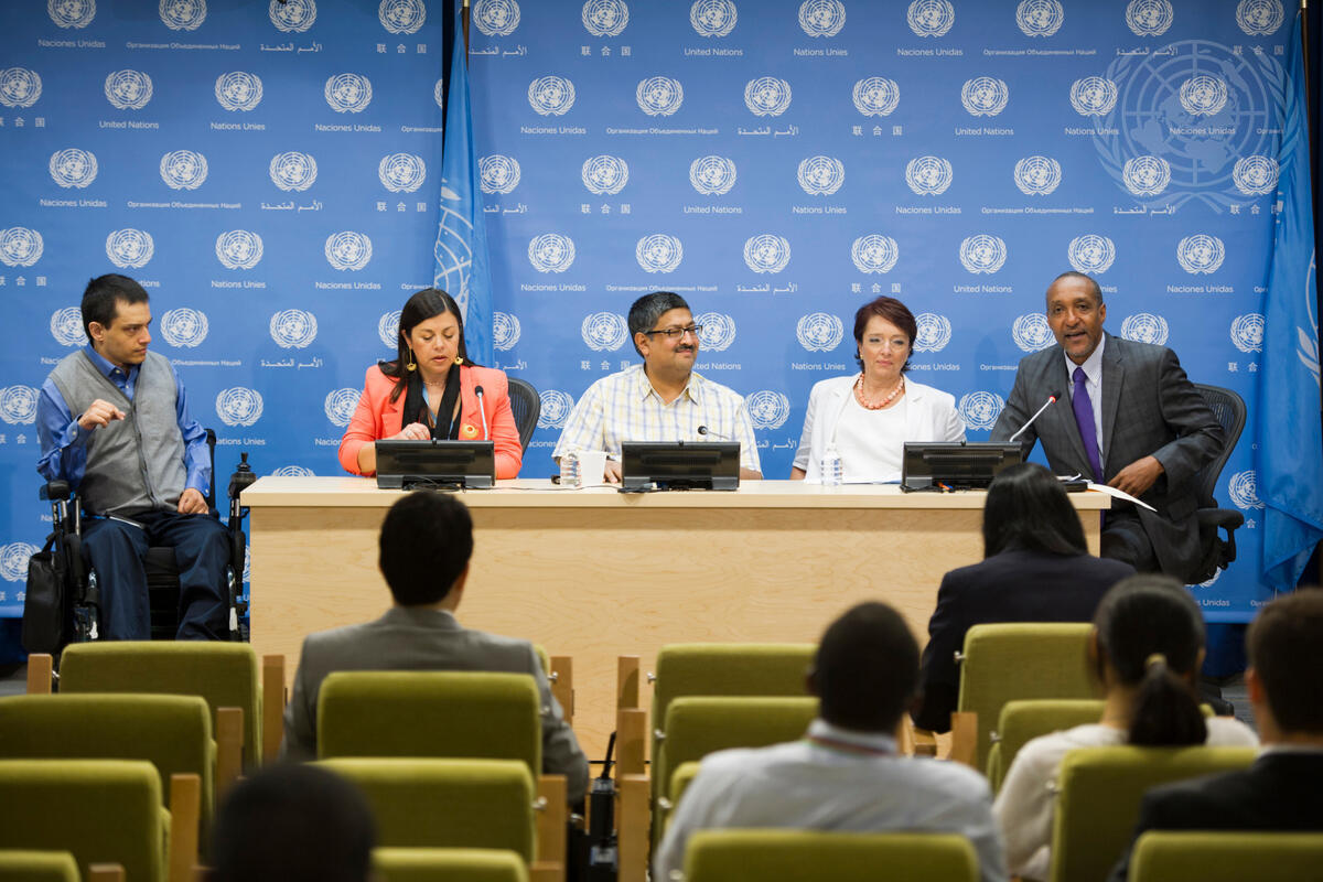 Macharia Kamau (right), Permanent Representative of the Republic of Kenya to the UN and President of the Conference of States Parties to the Convention on the Rights of Persons with Disabilities, briefs journalists on the sixth session of the Conference, taking place in New York 17-19 July. Also addressing correspondents were (from right): Daniela Bas, Director of the UN Division for Social Policy and Development, Department of Economic and Social Affairs; Javed Abidi, Chairperson of Disabled Persons International; and Maria Soledad Cisternas Reyes, Chairperson of the Committee on the Rights of Persons with Disabilities.
