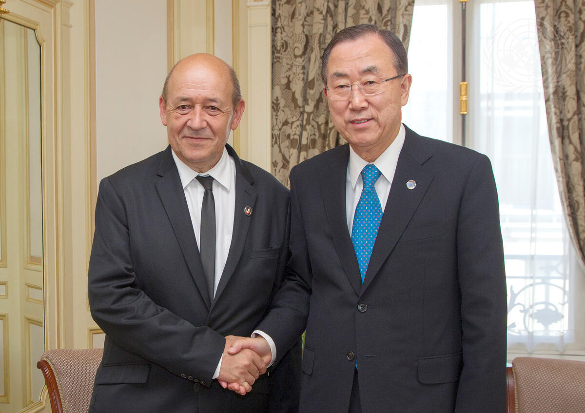 Secretary-General Ban Ki-moon (right) meets with Jean-Yves Le Drian, Minister of Defence of France.