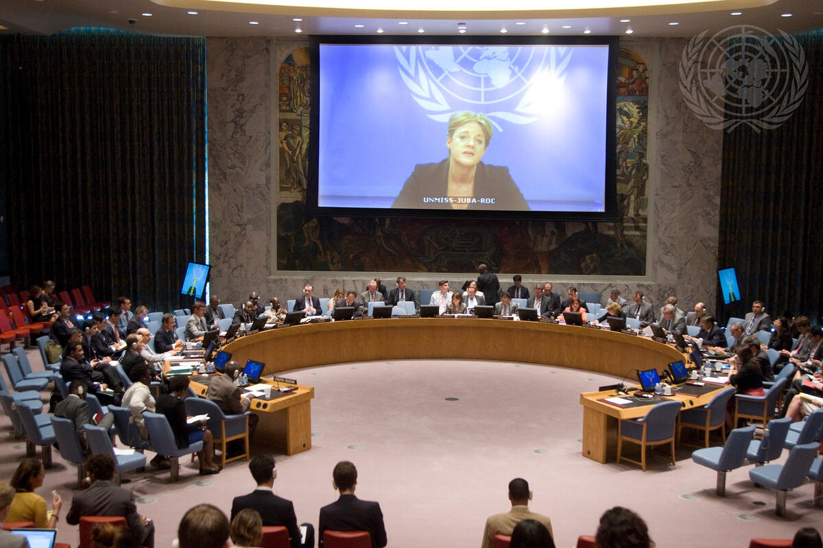 A wide view of the Security Council Chamber as Hilde Johnson (shown on screen), Special Representative of the Secretary-General and Head of the UN Mission in South Sudan (UNMISS), briefs the Council via video link on developments in that country and implementation of the Mission’s mandate.