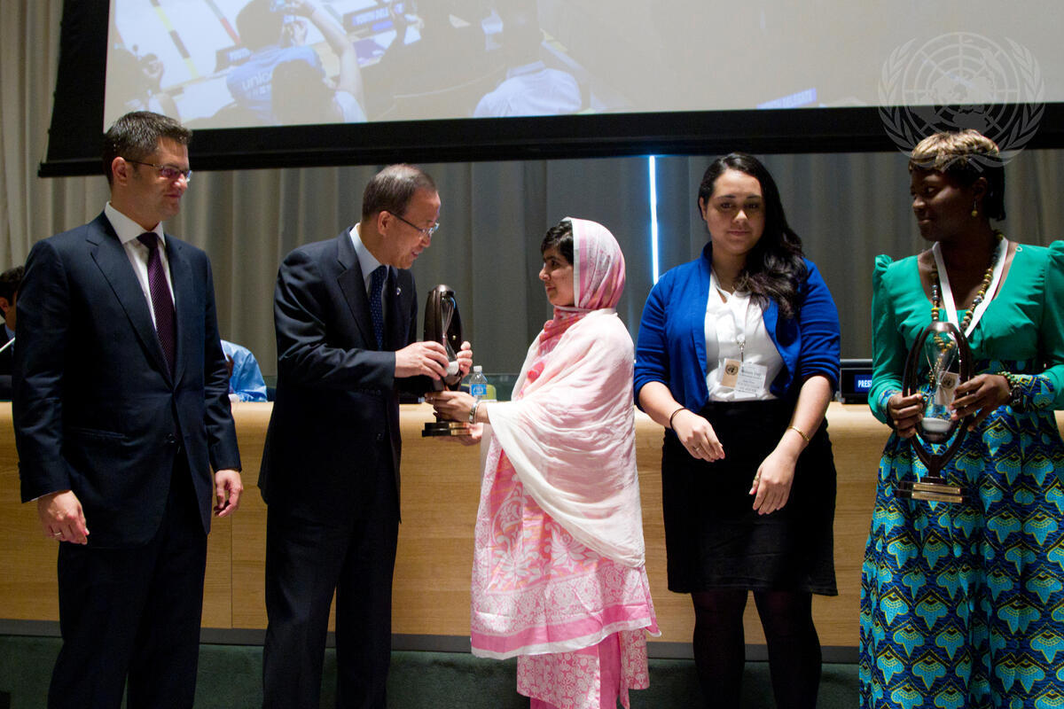 Malala Yousafzai (centre), the young education rights campaigner from Pakistan, with Secretary-General Ban Ki-moon (second from left) and General Assembly President Vuk Jeremic (left), at the “Malala Day” UN Youth Assembly. Taking place on Malala’s sixteenth birthday, the event brought together the young campaigner and hundreds of students from over 80 countries to call for quality education for every girl and boy in the world. It was also addressed by the Secretary-General and Assembly President, as well as UN Special Envoy for Global Education, Gordon Brown.