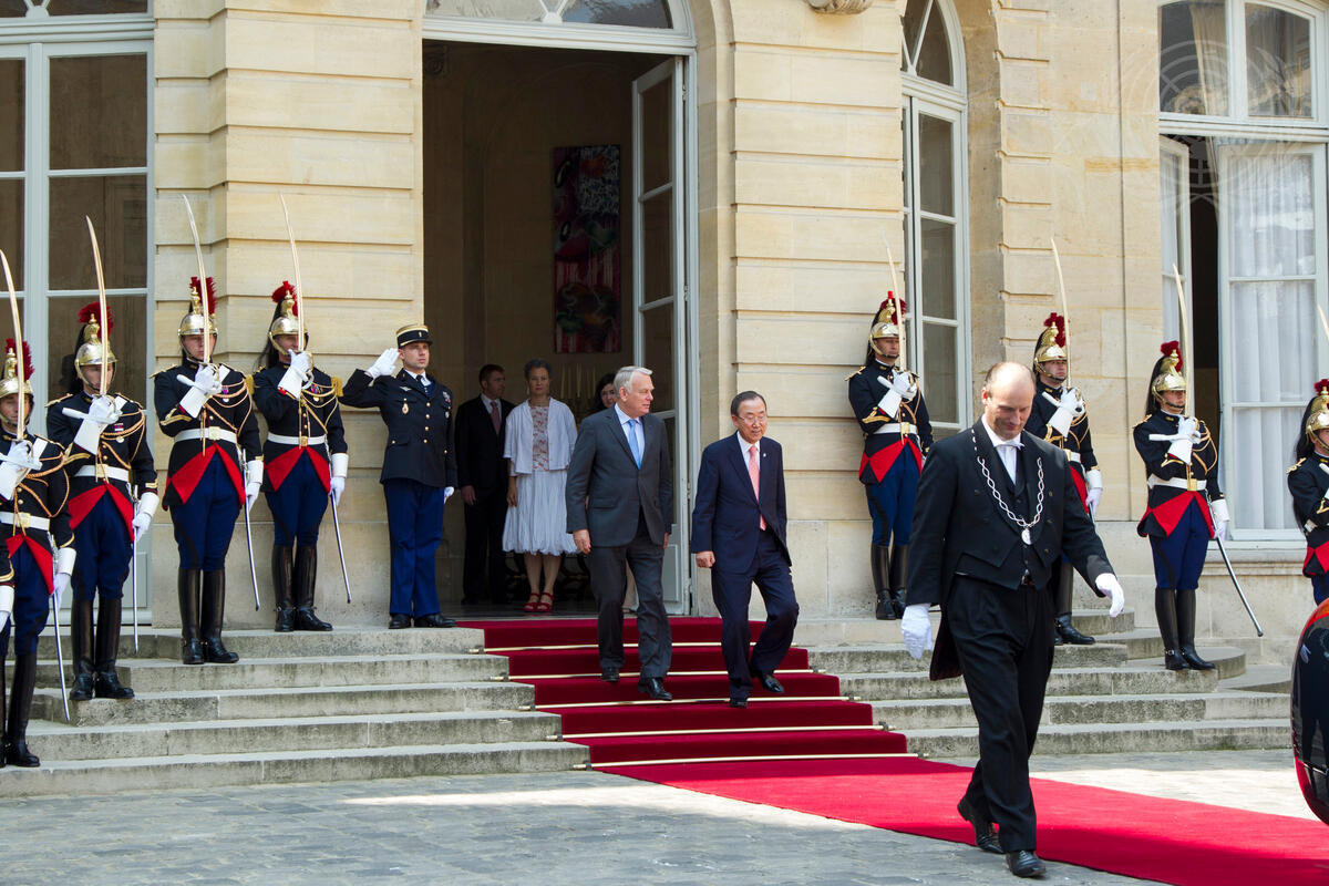Secretary-General Ban Ki-moon (centre right) meets with Jean-Marc Ayrault (centre left), Prime Minister of France.