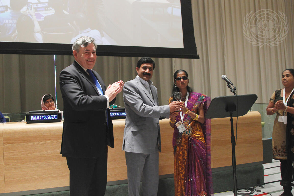 Gordon Brown (left), UN Special Envoy for Global Education, presents UN leaders with hourglasses as a symbolic petition to take urgent action on universal primary education as the 2015 deadline for the Millennium Development Goals (MDGs) approaches. Today's event were part of a Wish for Action on Global Education from Malala Yousafzai (behind, to the left), the young education rights campaigner from Pakistan, as she celebrated her birthday today at UN Headquarters in New York.