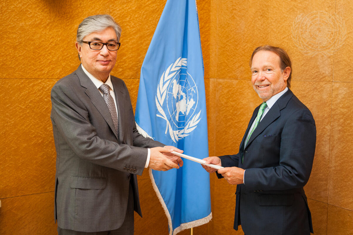 Jose Luis Balmaceda Serigos (right), new Permanent Representative of Chile to the United Nations Office at Geneva (UNOG), presents his credentials to UNOG Director-General Kassym-Jomart Tokayev.