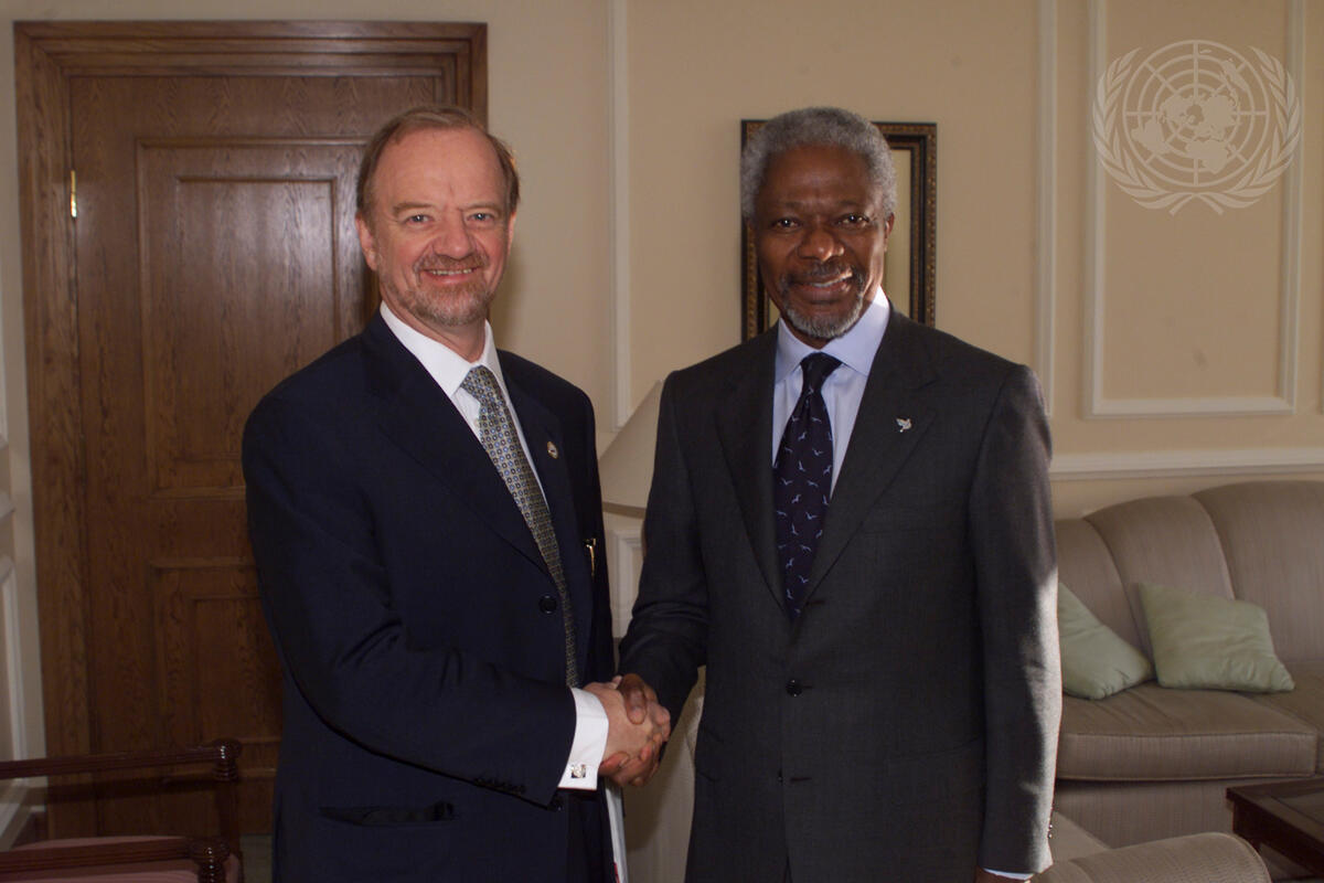 Secretary-General Kofi Annan with Robin Cook (left), Foreign Secretary of the United Kingdom, at the site of the Organization for Security and Cooperation in Europe (OSCE) Summit.