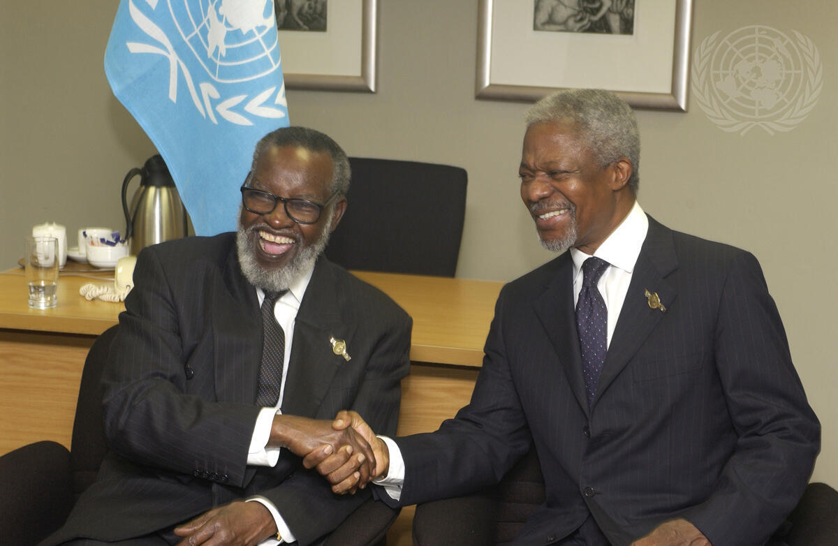 Mr. Annan (right) meets with President Sam Nujoma of Namibia, at the Intemational Convention Center in Durban.