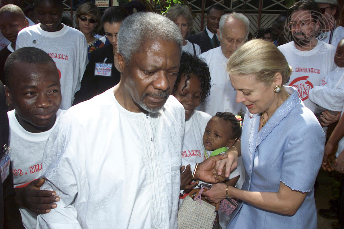 Secretary-General Kofi Annan (centre) and Nane Annan (right) visits St. Michael's Interim Care Centre of the Family Home's Movement, a rehabilitation centre for former child combatants.