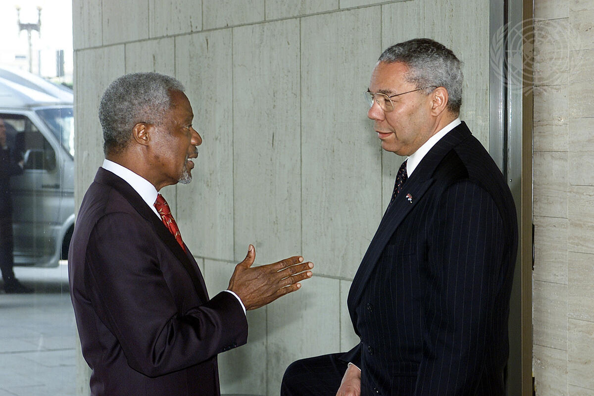 Secretary-General Kofi Annan (left) meeting with the United States Secretary of State, Colin Powell (right).