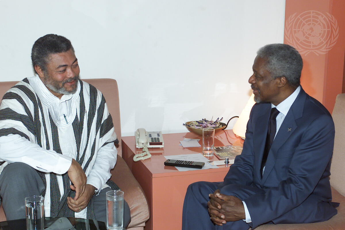 Secretary-General Kofi Annan (right) meeting with the former President of Ghana, Flight Lt. Jerry J. Rawlings, at the Hilton Hotel, in Abuja.