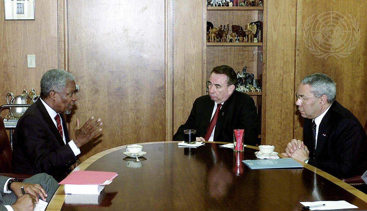 Secretary-General Kofi Annan (left) meeting with the Secretary of Health and Human Resources of the United States, Tommy Thompson (centre), and the United States Secretary of State, Colin Powell (right).