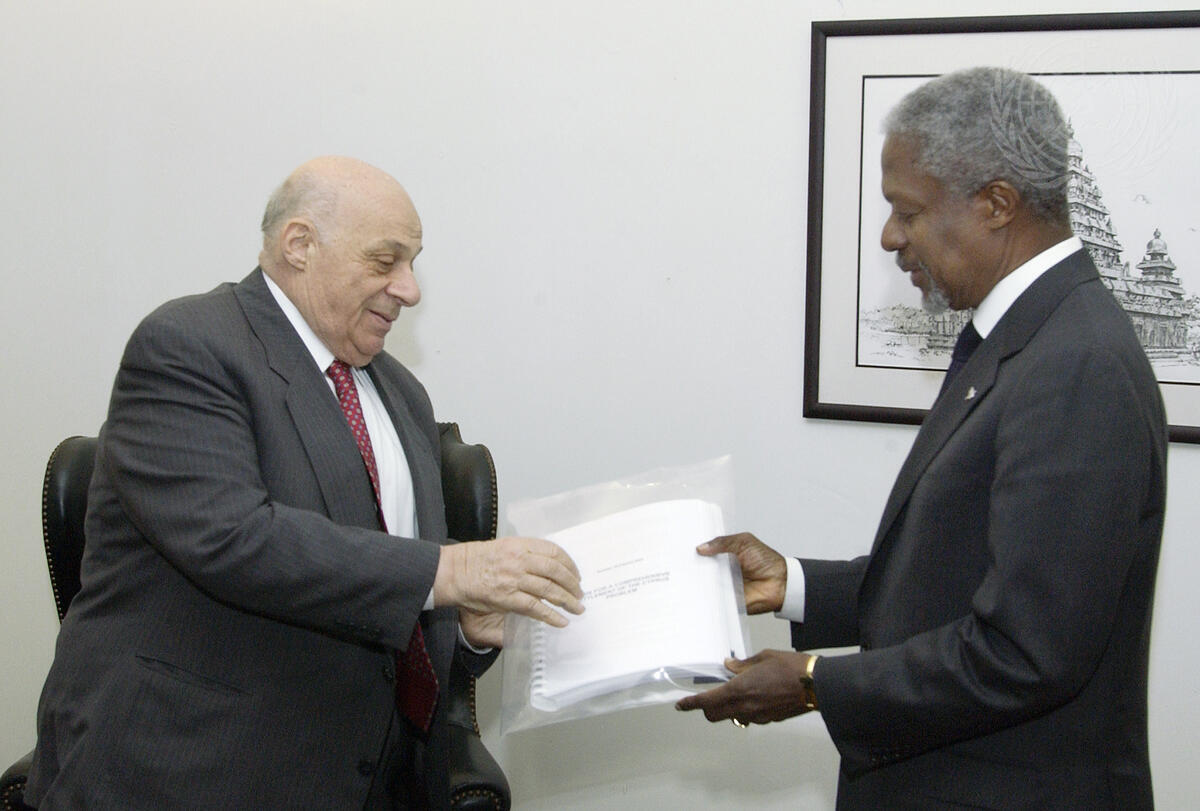 Mr. Annan meeting with Rauf Denktash, the Turkish Cypriot leader. The Secretary-General is presenting him with the revised draft for a comprehensive settlement.
