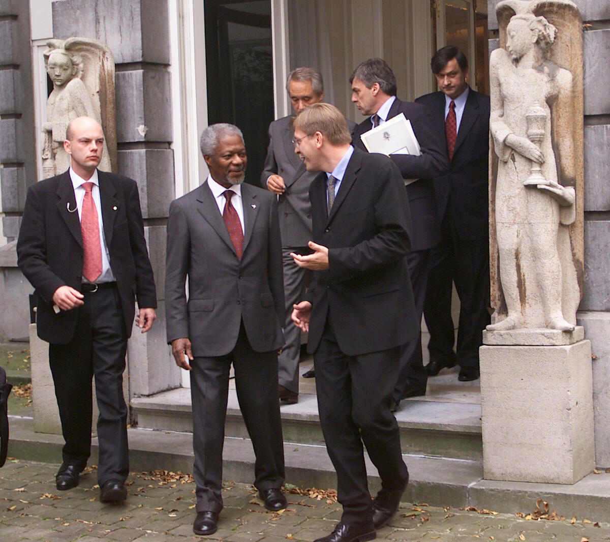 Secretary-General Kofi Annan (left) talking with Guy Verhofstadt (right), Prime Minister of Belgium, as they depart from the Prime Minister's office.