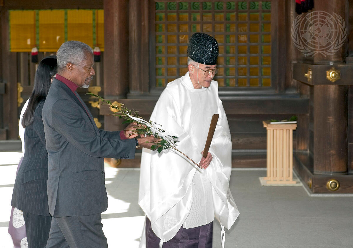 Secretary-General Kofi Annan (left) visited Meiji Jingu - the Shinto shrine dedicated to Emperor Meiji and Empress Shoken situated in a 700,000 square meter forest in the middle of Tokyo. After listening to the beating of a huge Japanese drum, the Secretary-General lays a ceremonial tree branch at the shrine's altar.