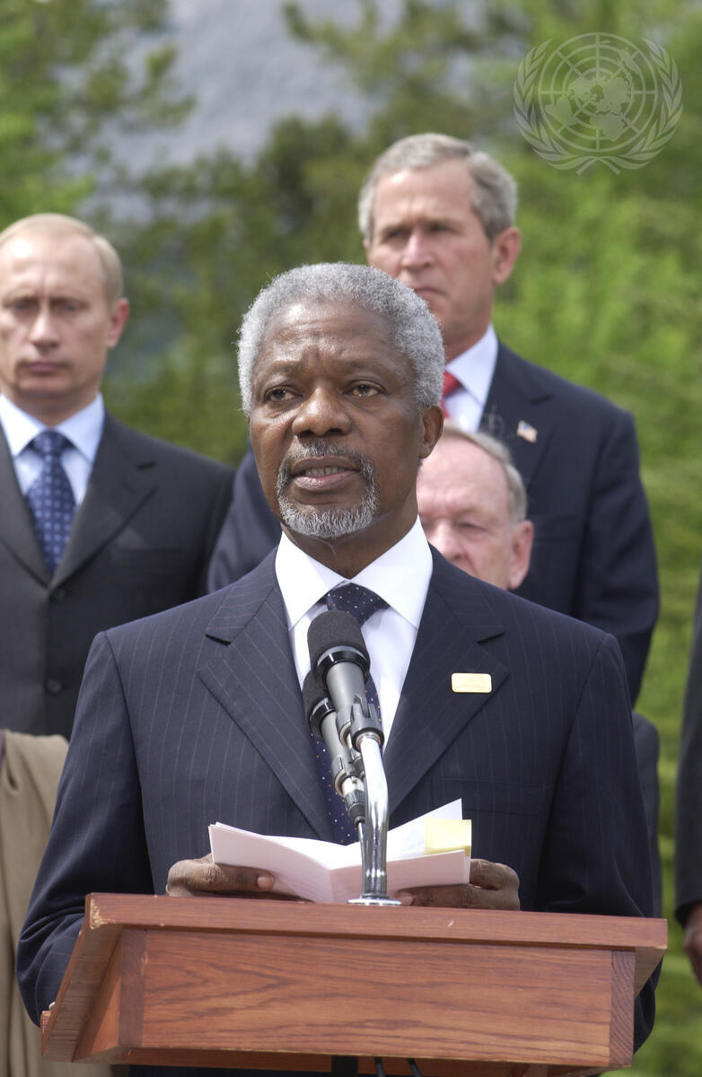 Secretary-General Kofi Annan (in front) speaking at the release of the African Action Plan after the G-8 Summit working session with African leaders on June 27.