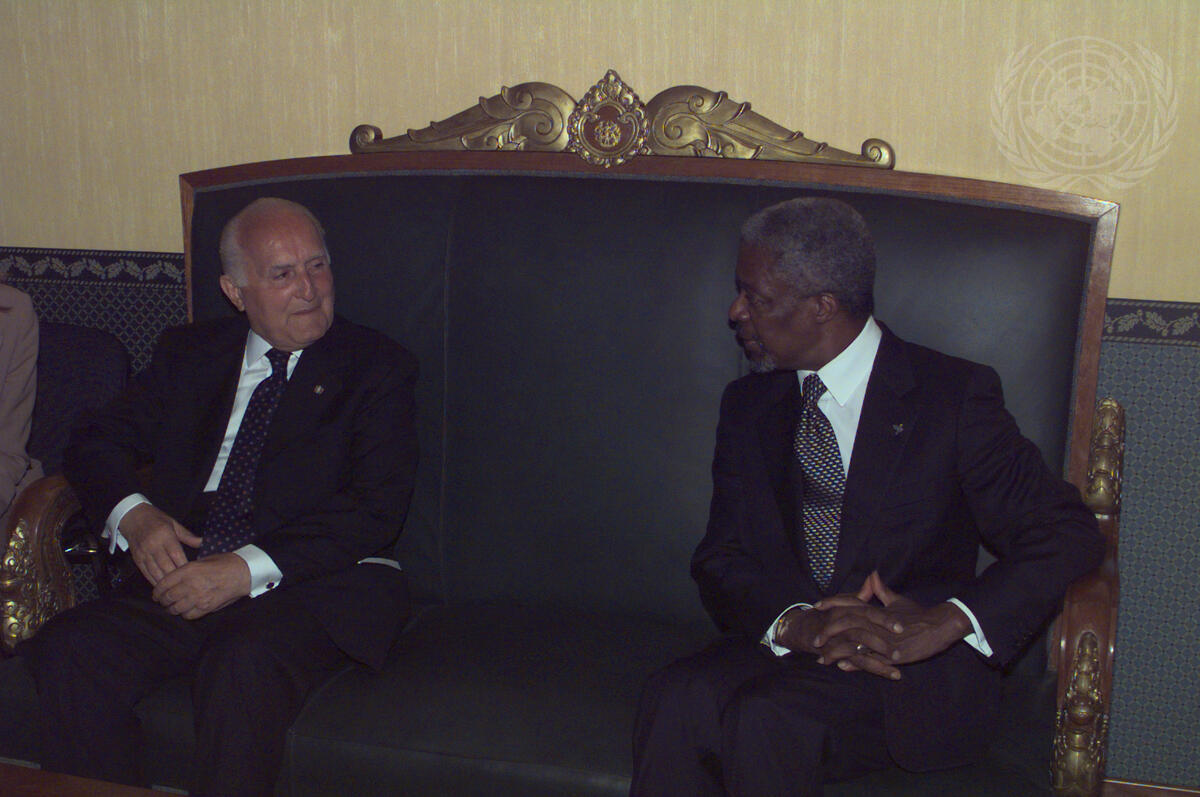 Secretary-General Kofi Annan (right) meeting with Dr. Oscar Luigi Scalfaro, President of Italy, at FAO's Headquarters before the start of the Conference.