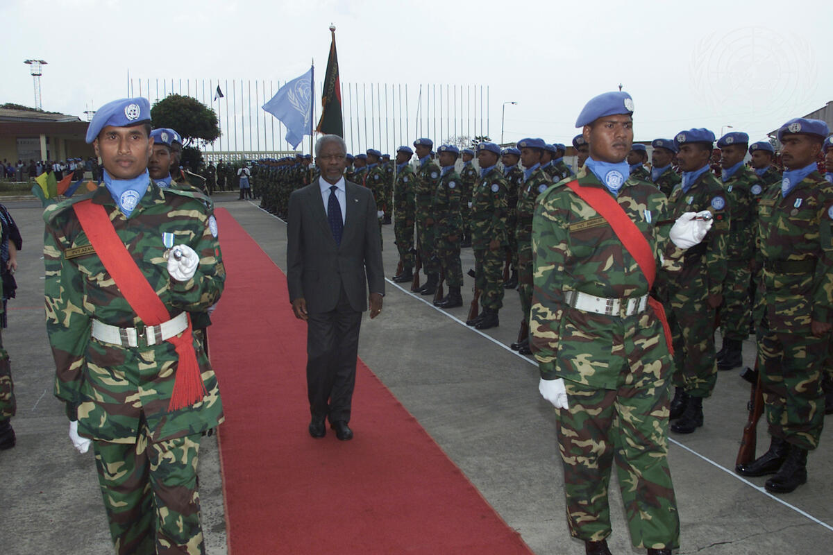 Secretary-General Kofi Annan reviews the United Nations Mission in Sierra Leone (UNAMSIL) Honour Guard.